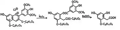 На примере мальвин хлорида было показано, что H2O2 окисляет антоциан, образуя мальвон в данном случае. Метод определения структуры в данном основан на том, что сахаридную, в то время как сахаридная группа в 5-ом положении, соединенная с ароматическим кольцом гликозидной связью, может быть разрушена только кислотным гидролизом[20].