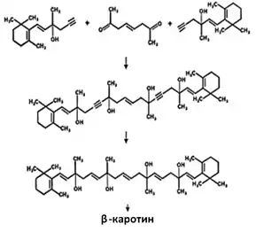 В 1950 Каррер и Eugster впервые осуществили синтез кристаллического β-каротина, используя в качестве исходных соединений: С8-дион, и ацетиленкарбинол. В основу синтетической схемы была положена реакция Гриньяра. Гидрирование и последующая изомеризация привели к получению β-каротина[1].
