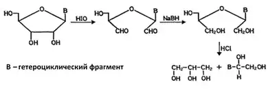 - Схема, представленная ниже наглядно иллюстрирует микрометод, описанный Каррером в последней его работе по сахарам, для определения кольцевой структуры нуклеозидов. Структуру, образующегося в результате такого расщепления спирта, например, глицерина производят методом бумажной хроматографии[9].