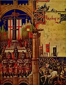 Карроччо (итал. Carroccio) — четырёхколёсная повозка-алтарь, на которой закреплялся большой прямоугольный флаг (штандарт), буксируемая волами. Использовалась в средневековой Италии. Это была прямоугольная платформа, на которой крепился штандарт города и был установлен алтарь. Священники вели службу на алтаре во время битвы, и трубачи на повозке рядом с ними воодушевляли солдат к бою.
