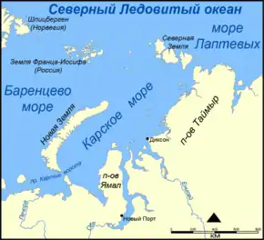 Порты — Диксон и Сабетта. Через Карское море проходит Северный морской путь.