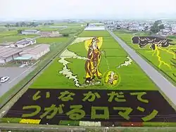 В 1993 году жители японского села Инакадате префектуры Аомори с целью привлечения туристов придумали художественное оформление обычных рисовых полей. Каждый год перед посадкой риса они выбирают художественный образ и воплощают его на поле, используя сорта риса разных цветов. Помимо традиционных японских сюжетов на полях реализуются и знакомые всему миру образы. В 2003 году была изображена Мона Лиза, в 2009 году — Наполеон, в 2013 — Мэрилин Монро. Посмотреть на эти произведения, существующие только несколько месяцев, приезжают много туристов. Так в 2006 году эти места посетило более 200 000 человек. С созреванием риса изображения меняются в оттенках, а собранный на полях урожай этого злака продаётся по обычным ценам.