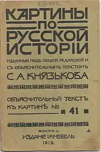 «Картины по русской истории» (1908—1913), издание И. Н. Кнебеля — серия из 50 выпусков брошюр в жанре школьного пособия с иллюстрациями, оригиналы для которых выполнили художники Серебряного века. Под общей редакцией и с объяснительным текстом С. А. Князькова. Тираж 3500 штук, размер репродукций 66х88 см.