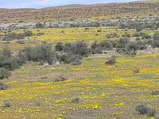 Наименее засушливая часть региона — Малое Кару — представляет собой глубокую долину в Капских горах между горами Лангеберге на юге и Свартберге на севере на высоте 300—600 м над уровнем моря. Длина долины 245 км, средняя ширина около 48 км. Годовое количество осадков варьирует в пределах от 400 мм на склонах гор до 130 мм на дне долин[13]. Населённые пункты сосредоточены в долинах рек Гауритс, Хрут, Тоус, Улифантс и Камманасси.[13] Большое Кару площадью более 400 кв. км, расположенное к северу от Малого, является типичной полупустыней с соответствующей флорой и фауной. В геологическом плане это эрозионная впадина возрастом около 250 млн лет, место, куда текут реки с вершин Большого Уступа. По направлению рек различают два бассейна — западный и восточный, первый из которых длиной 225 км и шириной 80 км, второй длиной 480 км и шириной 130—80 км. Среднее количество выпадаемых осадков постепенно снижается с востока на запад — от 400 мм на восточной границе до 100 мм на западной[14]. Средняя высота Большого Кару 450—750 м над уровнем моря[10]. Верхнее Кару обычно рассматривается как составная часть южно-африканского плоскогорья, представляет собой плато на высоте 1000—1300 м между рекой Оранжевой и Большим Уступом[10].