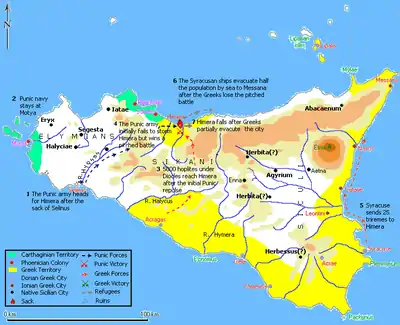 Элимы, опасаясь, что к селинунтским войскам присоединятся сиракузские, пошли на уступки в пограничном споре, но когда греки не удовлетворились занятием спорных районов, а двинулись вглубь территории противника, элимы в 410 до н. э. обратились за помощью к своим старым союзникам карфагенянам[7].