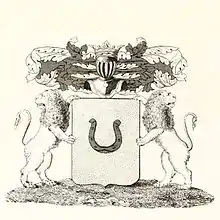 Щит увенчан дворянскими шлемом и короной. Намёт на щите золотой, подложенный голубым. Щитодержатели: два льва.