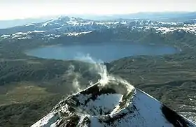 ![]() Карымское озеро (на переднем плане — вершина вулкана Карымская Сопка) | |