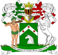 В щите, имеющем зелёное поле, в нижней части означена Голова серебряного Единорога и над ней поставлено серебряное Стропило с изображением на нём трёх красных Звезд.