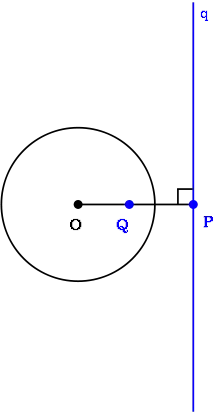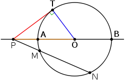 Никакая касательная прямая не может проходить через точку внутри окружности, поскольку любая такая прямая должна быть секущей. В то же время для любой точки, лежащей вне круга, можно построить две проходящие через неё касательные прямые. Геометрическая фигура, состоящая из окружности и двух касательных прямых, также обладает осевой симметрией относительно прямой, соединяющей точку P с центром окружности O (см. рисунок справа). В этом случае отрезки от точки P до двух точек касания имеют одинаковую длину. По теореме о степени точки квадрат длины отрезка до точки касания равен степени точки P относительно окружности C. Эта степень равна произведению расстояний от точки P до двух точек пересечения окружности любой секущей линией, проходящей через P.