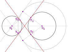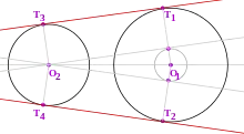 - Если окружности не соприкасаются (), что является общим положением, имеются четыре касательные, касающиеся одновременно обеих окружностей.
