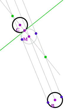 Геометрически это соответствует вычислению угла, образованного касательной и прямой, проведённой через центры, а затем линия центов поворачивается для получения уравнения касательной. Угол можно вычислить с помощью тригонометрии из прямоугольного треугольника, вершинами которого являются (внешний) центр гомотетии, центр окружности и точка касания. Гипотенуза лежит на прямой центров, радиус является катетом, противоположным углу, а прилегающий к углу катет лежит на касательной прямой.