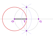 Относительно легко построить прямую t, касательную к окружности в точке T на окружности. Для этого следует провести прямую a через центр окружности O и точку T. Тогда прямая t является перпендикуляром к прямой a. Один из способов построения перпендикуляра следующий (см. рисунок). Проводим тем же радиусом (r) окружность с центром в точке T, получаем вторую точку G на прямой a, а точка T становится серединой отрезка OG. Проводим две окружности радиуса R>r с центрами в точках O и G. Прямая, проходящая через точки пересечения этих окружностей, будет касательной.
