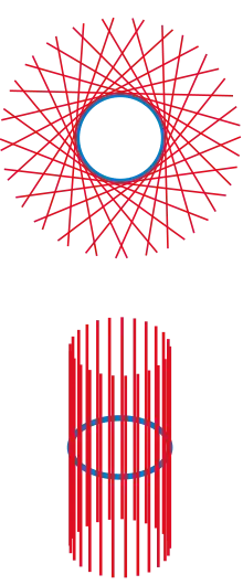 - Единичная окружность . Её касательное расслоение также тривиально и изоморфно . Геометрически, оно является цилиндром бесконечной высоты (см. картинку вверху).