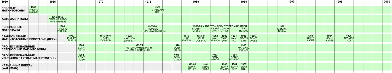 К началу 1970-х годов на рынках развитых стран доминировали горизонтальные (настольные и переносные) монофонические магнитофоны и стереофонические приставки. Технически все эти аппараты были сходны: их простые, одномоторные лентопротяжные механизмы (ЛПМ) напрямую восходили к спецификации стандарта Philips 1963 года[32].