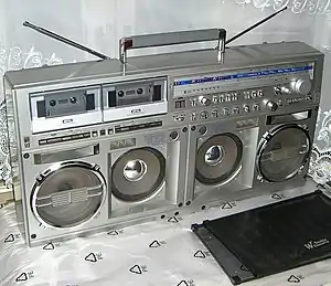 Бытовая электроника 1960-х годов эволюционировала в сторону миниатюризации, но в 1970-е годы развитие повернуло вспять[105]. Японские корпорации начали последовательно увеличивать габариты переносных магнитофонов и магнитол в попытках приблизить качество звучания к стандартам стационарной аппаратуры[105]. На национальном японском рынке крупногабаритные магнитолы были востребованы горожанами, жившими в тесных домиках и квартирах, как замена традиционным, блочным аудиосистемам[105]. Около 1976 года японцы вышли на рынок США; три-четыре года (1976—1979) ушло на отработку типовых конструкций для американских потребителей — преимущественно афроамериканской и испаноязычной молодёжи больших городов[106][105]. В 1979 году[106] стереомагнитолы вышли на улицу, став непременным атрибутом жизни цветных кварталов[105][107], символом демонстративного потребления городской бедноты[108]. В 1981 года газета The New York Times впервые употребила неологизм «бумбокс» (англ. boombox), к 1983 году оно прочно вошло в язык рекламы, а появившееся в 1982 году словосочетание «гетто-бластер» (англ. ghetto blaster) осталось в разряде пейоративов[109][110][107].
