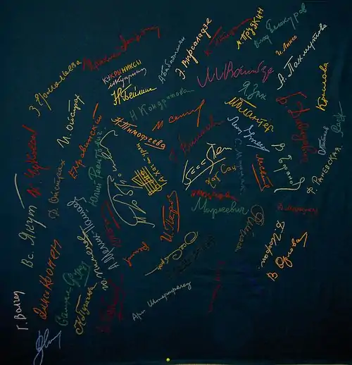 - Всех гостей, расписывавшихся на скатерти, Кассирский просил писать полную фамилию. Нарушил это правило А. И. Солженицын, он сказал, что в этом случае скатерть будет опасно показывать (Солженицын был одним из самых известных диссидентов в СССР), и расписался первыми четырьмя буквами своей фамилии.