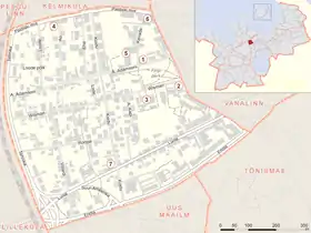 Улицы микрорайона: Амандуса Адамсона, Ао, Артура Капа, Вилларди, Висмари, Кеваде, Койду, Лойте, Лооде, Лооде пыйк, Луйзе, Роопа, Техника, Тоомпуйестеэ, Эндла, Палдиское шоссе, Эха.