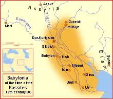 Благодаря нашествию хеттов, касситам в 1595 г. до н. э. удалось свергнуть аморейскую династию[7] и установить контроль над Вавилоном и править им в XVI—XII вв. до н. э. В XV в. до н. э. касситский царь Улам-Буриаш захватывает южную Месопотамию и нарекает себя «царем Вавилона, царем Шумера и Аккада, царем касситов и царем Кар-Дуниаша». Царские указы высекались на камнях кудурру[8]. В XIV в. до н. э. обозначилась ассирийская опасность. В Касситский период касситы превратились в привилегированный класс вавилонского общества, которые разделили страну на дома (биту), во главе дома стоял господин (бэл бити), который ведал системой местного налогообложения и организовывал общественные работы по обслуживанию системы ирригации. Важную роль играли сословия жрецов и купцов[9]. Усиливается культ бога Мардука. Развиваются отношения с Египтом (династические браки, торговля, переписка)[10].