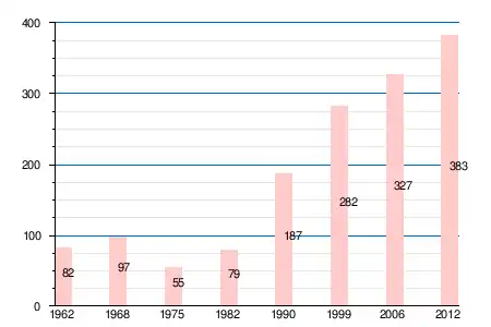 | 1962 | 1968 | 1975 | 1982 | 1990 | 1999 | 2005 | 2006 | 2010 | 2011 | 2012 |
