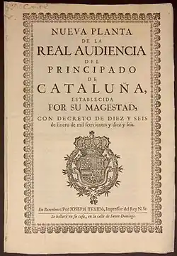 Территории распространения каталанского языка отныне делились на провинции, которыми управляли назначенные из Мадрида губернаторы (кат. Capità General), для управления экономикой и финансами создавались специальные провинциальные органы, которыми руководили интенданты (кат. intendències provincials). В Мадриде были созданы государственные секретариаты (кат. secretaries d'Estat), которые впоследствии стали именоваться министерствами. При короле был создан Совет Кастилии (исп. Consejo de Castilla), где прежнее Арагонское королевство имело меньше депутатов, чем, например, Наварра, Галисия или Астурия, а также испанский парламент, который, впрочем, не играл большой роли в централизованной испанской монархии.