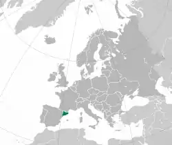 ![]() Каталония (выделена зелёным цветом) на карте Европы (выделена серым цветом) |