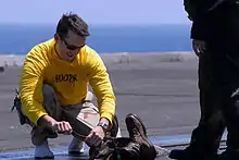 Офицер катапульты даёт команду на запуск ботинок