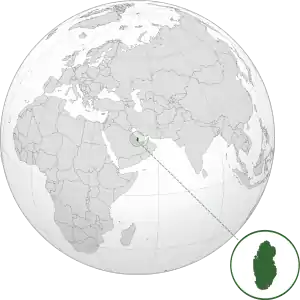 Ката́р[6], или Ка́тар[7] (араб. قطر [ˈqɑtˁɑr], местн. [ɡitˁar][8]), официально — Госуда́рство Катар (араб. دولة قطر [ˈdawlat ˈqɑtˁɑr]), — государство (эмират) на Ближнем Востоке, расположенное на Катарском полуострове в северо-восточной части Аравийского полуострова. Граничит с Саудовской Аравией на юге, со всех остальных сторон омывается Персидским заливом (из-за наличия в прошлом спорной территории между Саудовской Аравией и ОАЭ на многих картах Катар изображён граничащим также с ОАЭ). На северо-западе имеет морскую границу с островами Бахрейн, на юго-востоке — морскую границу с ОАЭ. Столица — город Доха.