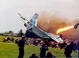 ![]() Су-27УБ борт 42 падает на зрителей. Пилоты катапультируются | |