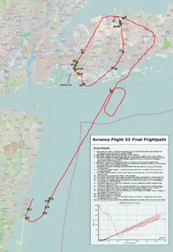 В 21:30:55 КВС дал указание установить закрылки на 14°. Одновременно с ним диспетчер дал указание: Авианка пятьдесят два, следуйте курсом три шесть ноль, пожалуйста. Второй пилот сообщил командиру, что закрылки выпущены на 14°, а когда тот спросил, каким курсом следовать, то ответил, что 360°. В 21:31:01 диспетчер NY TRACON сообщил: О'кей, вы номер два в заходе на посадку. Просто я должен дать вам достаточно пространства, так как вы будете выполнять её без возможности повторного захода[15]. В 21:31:22 КВС спросил: Три шестьдесят, нет?, на что второй пилот ответил: Три шестьдесят. В 21:32:07 рейсу AVA052 было дано указание повернуть на курс 330°[16].