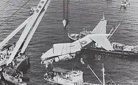 В 19:00:20 с самолёта доложили о визуальном заходе на посадку, после чего связь прервалась. Диспетчер попытался вызвать их, но ему не ответили, а отметка рейса пропала с экранов. Тогда диспетчер связался с Convair 880 компании Japan Airlines и спросил, видят ли они Боинг, на что пилоты доложили о наблюдении вспышки в заливе. Также о вспышке в заливе впоследствии сообщили и рыбаки. В 20:00 на поиск авиалайнера были отправлены корабли и самолёты береговой охраны и воздушных сил самообороны. Они обнаружили на поверхности воды большое масляное пятно, что подтвердило худшие опасения — Боинг врезался в воду в 12 километрах от аэропорта и затонул.