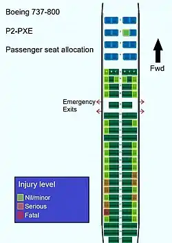Первоначально сообщалось об отсутствии погибших[7], однако 1 октября авиакомпания Air Niugini сообщила, что дайверы нашли на дне лагуны тело 1 погибшего пассажира (гражданина Индонезии)[13]. Изначально заявлялось, что пассажир был замечен в одной из лодок, однако по прибытии на берег он не был обнаружен. Основной версией его гибели стало то, что он не был пристёгнут ремнём безопасности[13].