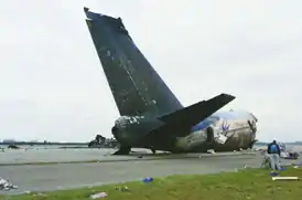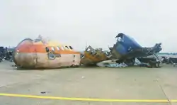 Левое крыло врезалось в кран экскаватора и оторвалось, также оторвалась носовая стойка шасси; правое крыло оторвалось после столкновения с карьерным погрузчиком. Из повреждённых топливных баков вытек авиакеросин, который тут же воспламенился. Проскользив несколько сотен метров по полосе, лайнер разрушился на две части и загорелся. На место катастрофы прибыли 41 пожарная машина, 58 автомобилей скорой помощи и 436 спасателей; примерно в 00:00 NST 1 ноября пожар был локализован.