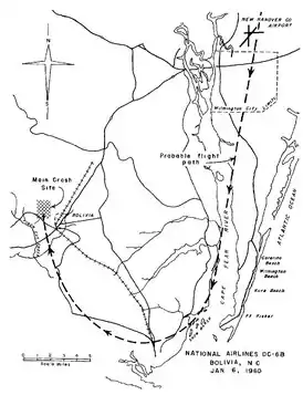 Обломки самолёта были разбросаны на большой территории близ Боливии. Также отдельные фрагменты обнаружили у Кура-Бич, который расположен на 16 миль (26 км) к востоку от Боливии. Так как фюзеляж разрушился на мелкие части, следователям пришлось прибегнуть к трёхмерной реконструкции, для чего найденные обломки доставляли в Уилмингтонский аэропорт, где монтировали на выполненном из проволоки и дерева каркасе, имеющего контуры и размеры самолёта DC-6B[8].