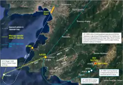 - После прохода VOR Аяччо поступательная скорость самолёта была выше максимально установленной на маршруте ожидания, так как экипаж не изменил её с учётом попутного ветра. Тем не менее, траектория самолёта находилась в пределах безопасной области маршрута ожидания.