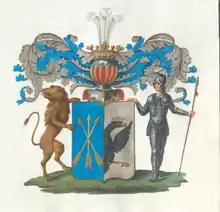 Описание герба: Выдержка из Общего гербовника Щит разделен перпендикулярно на две части, из коих в правой части, в голубом поле, изображены крестообразно три золотые стрелы, остриями обращенные вверх. В левой части, в серебряном поле, означен выходящий до половины черный орел в золотой на главе короне. Щит увенчан обыкновенным дворянским шлемом с дворянскою на нем короною и тремя страусовыми перьями. Намет на щите серебряный, подложенный голубым цветом. Щит держат с правой стороны лев с загнутым хвостом натурального цвета, а с левой стороны – воин, одетый в латы, имеющий в руке копье. |
