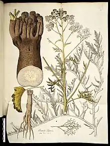 Прикорневые листья большие, черешковые, глубоко двоякоперисторазделъные, с продолговатыми и линейно-продолговатыми зубчатыми долями, ланцетные, цельные.