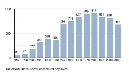 Согласно оценочным данным за 2008 год, население Каунсила составляло 680 человек.[1] Плотность населения равна 357,89 чел./км². Средний возраст населения — 43 года и 2 месяца. Половой состав населения: 50,9 % — мужчины, 49,1 % — женщины. В 2000 году насчитывалось 339 домашних хозяйств и 223 семейств. Расовый состав населения по состоянию на 2000 год:[4]