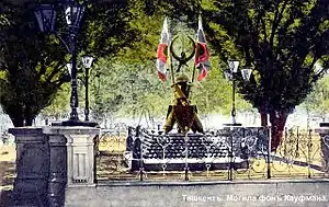 - В книге И. Добросмыслова «Ташкент в прошлом и настоящем» (Ташкент, 1912 год), с.192, написано следующее: «Первая могила К. П. фон — Кауфмана была между четырёх крестообразно расположенных карагачей (вязов) и кустов роз и жасмина. В 1889 по окончании постройки военного собора, 4 мая останки Константина Петровича были торжественно перенесены в собор, а на месте временной могилы предложено было поставить ему памятник в виде его бюста, но это предложение не приведено в исполнение. Место бывшей могилы украшено и приведено в полный порядок, для чего по подписке собрано 5300 руб. из которых 312 руб. в 1893 передано городскому самоуправлению. Место это обнесено железной решеткой на высоком цоколе с тройными фонарями по углам. В середине загородки имеется четырёхугольное возвышение из орудийных снарядов, на котором поставлены дулами вниз три перекрещивающихся вверху орудия, на котором лежит крупный орудийный снаряд увенчанный крестом, а в промежутках между орудиями водружены два георгиевских знамени и прикреплены щиты с подобающими надписями.»