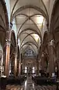 Собор трёхнефный, внутреннее убранство выполнено в готическом стиле, который подчёркивают колонны из красного веронского мрамора, стрельчатые аркады, крестовые своды с золотыми звёздами на голубом фоне. Боковые алтари и приделы устроены в особых секциях, расписанных в XVI веке Джованни Фальконетто.
