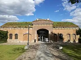Сохранившийся западный тет-де-пон представляет собой двухэтажное прямоугольное здание, покрытое земляной насыпью, с пятью казематами, выполненными из клинкерного кирпича. Вход осуществляется через въездные ворота на первом этаже, которые через коридор ведут на мост. Северное крыло служило казармой, а южное крыло с отдельным входом, скорее всего предназначалось для охраны или пожарной части. До здания шлюза, расположенного на береговом откосе, примыкает стена Карно с отверстиями для стрельбы[4].