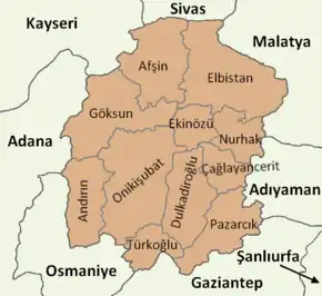 Кахраманмараш — самая восточная провинция Средиземноморского региона Турции. Граничит с илами Османие, Адана, а также регионами Центральная Анатолия, Восточная Анатолия и Юго-Восточная Анатолия.