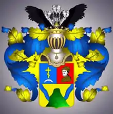 Щит разделён горизонтально на две части, из коих в верхней в правом голубом поле изображён золотой двойной Крест, поставленный над серебряною Луною, обращённою рогами вниз; в левом красном поле грудное изображение Человека. В нижней части в золотом поле зелёная Гора с истекающими из неё к верхним углам щита двумя Реками.