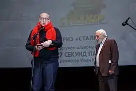![]() Иван Качалин (слева) и Константин Симонов на сцене Центрального дома кино в декабре 2019 года. | |