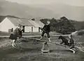 Подобные качели могут существовать в различных вариантах: качающиеся могут сидеть на противоположных концах балки или же висеть на них на руках.