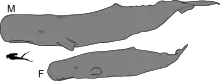 Самки вырастают лишь до 11, редко 13 м и веса 15 тонн[13]. Разница в размерах между самцом и самкой у кашалота — самая значительная среди всех китообразных[34].