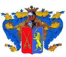 В щите, разделённом перпендикулярно надвое, в правой половине в красном поле крестообразно положены 2 золотые шпаги, остриями вверх (изм. польский герб Пелец). В левой половине в голубом поле находится лев с мечом в правой лапе.