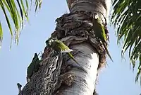 Гнездо устраивает в дуплах мёртвых старых пальм, на большой высоте; известны случаи их гнездования и в норах по берегам рек. Часто гнездятся колониями. В кладке 2—5 яиц. Насиживание длится 26—28 дней. Первые несколько дней самка не покидает гнездо, а самец её кормит и постоянно находится рядом, иногда залезая в него на ночь. Птенцы оперяются в 11—12 недель. После выхода птенцов из гнезда, их ещё две недели кормят родители.