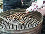 Плоды каштана готовят на жаровне, Сумаррага, Страна Басков; традиционные мебель и корзинка из каштана, Франция | ||||||||||