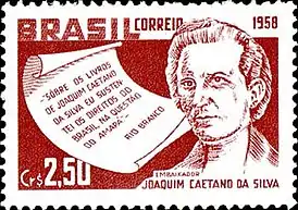 ![]() Почтовая марка Бразилии 1958 года, посвящённая Жоакину Каэтано да Силва с цитатой барона Риу-Бранку на португальском языке: «По книгам Жоакина Каэтано я доказывал права Бразилии в [выигранном у Франции] деле Амапа» (Sc #878) | |