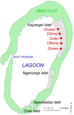 На восточной и южной сторонах есть четыре густо заросших лесом островка. С севера на юг: Каянгел (англ. Kayangel), Нгериунгс (англ. Ngeriungs), Нгеребелас (англ. Ngerebelas) и Орак (англ. Orak).